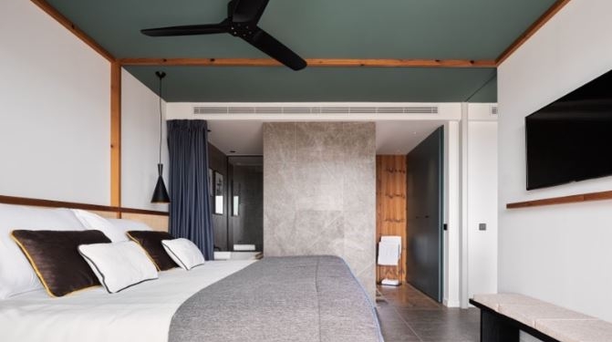 Con una paleta de colores que juega con tonalidades grises, verde oscuro, blanco y detalles en negro, las suites y junior suites del hotel Aubamar Suites & Spa reflejan la mezcla del carácter mediterráneo con el estilo colonial.