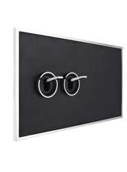 Este doble interruptor es un mecanismo eléctrico totalmente personalizable, y en este caso se ha optado por contrastar la placa de aluminium de acabado Black aluminium con arandelas y manecillas de acabado chrome-plated, colocadas de manera asimétrica.