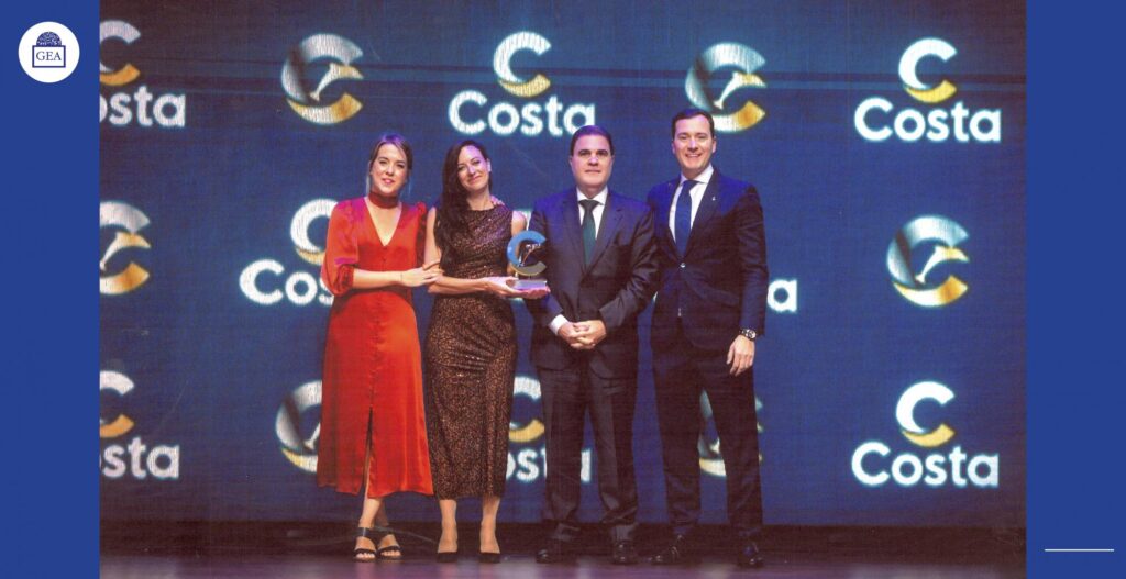 El premio de Grupo GEA ha sido entregado por el director comercial de Costa Cruceros en España y Portugal, Jorge Serrano, en compañía de la key account manager de la naviera, Patricia Sánchez. Ha sido un honor recibir el premio y pasar un rato agradable en compañía de las agencias GEA participantes y de otras muchas. Sin duda ha habido un ambiente cargado de sinergias, dice el director comercial y de marketing de Grupo GEA, David Cáceres. Por otro lado, ha sido un placer acompañar a nuestro partner Costa Cruceros en esta edición especial de los premios con motivo de su 75 aniversario. Les deseamos muchos años más, dice Cáceres.