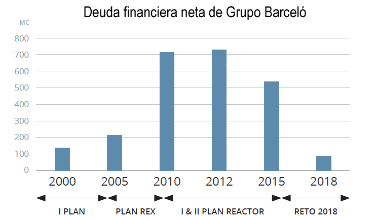El dato más espectacular corresponde al conglomerado turístico copresidido por Simón Barceló Tous y Simón Pedro Barceló Vadel, cuya deuda financiera neta se sitúa al cierre de 2018 en 50,3 millones de euros, lo que supone 0,1 veces el Ebitda del grupo. Se trata, además, de un descenso del 84,8% en comparación con los 330,7 millones que adeudaba en 2017, siendo la tercera bajada consecutiva desde los 717,3 millones que alcanzó en 2015.