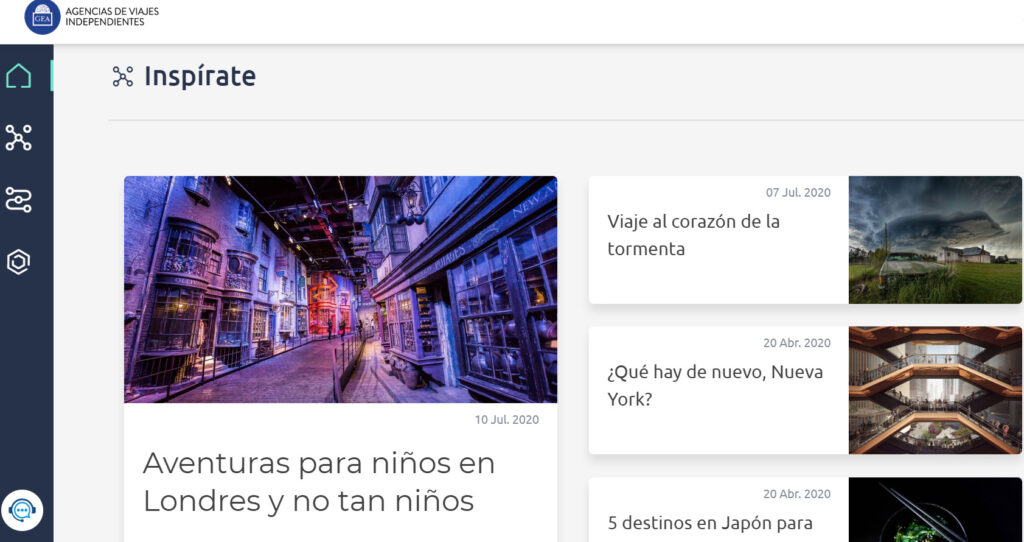 La plataforma es totalmente responsive, «y tiene la ventaja de que es una webapp, es decir, si el cliente se descarga en su móvil la página web, de forma automática lo que obtiene es el icono de una app hecha de forma exclusiva para él en su pantalla», cuenta Antonio Lara, director de nuevas tecnologías de Grupo GEA. La plataforma consta de varias secciones «que permite la relación directa con el cliente. Por un lado, la agencia puede enviar pequeños artículos de forma semanal al cliente con el fin de inspirar y motivar su próximo viaje, pero también puede incluir sus propias ofertas y llevar a cabo acciones de marketing directo. Además, la herramienta permite el contacto por Skype o correo electrónico de forma rápida entre el cliente y la agencia», especifica Lara.