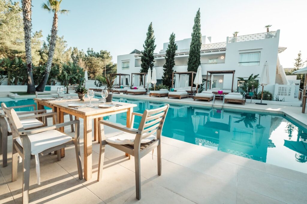 El hotel se ubica en un entorno natural que invita a la calma y permite descubrir algunas de las mejores playas de Ibiza como Es Pinet o Es Pouet, situadas a cinco minutos a pie del hotel boutique o un gran número de calas aclamadas, como Cala Bassa y Platges de Comte, ubicadas a 15 minutos en coche.