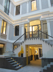 Dos grandes portones de madera de casi cinco metros dan la entrada al hotel, que se accede por una escalinata presidida por un techo artesonado original. Este tramo desemboca en un atrio donde se ubica la Recepción y la Cafetería. Destacan del espacio la altura de la galería de habitaciones que termina con una reproducción de la claraboya original y la gran escalinata de mármol de carrara y barandilla de forja recuperados, por donde se accede a las habitaciones.