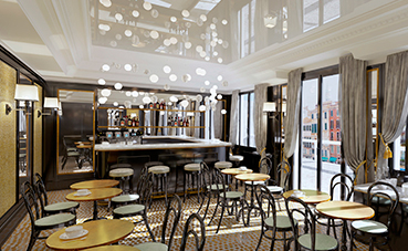 Asimismo, el establecimiento rinde homenaje a Venecia a través de un interiorismo que reinterpreta el pasado de la ciudad en clave moderna. En esta línea, se ha apostado por utilizar elementos y materiales tradicionales como el cristal de murano, junto con telas y tapicerías venecianas. En zonas se ha optado por los suelos de terrazo, típicos en las construcciones venecianas debido a sus características. El hotel, que ofrece Wi-Fi gratuito en todas sus instalaciones, cuenta con un amplio hall al que se accede a través de una puerta acristalada que mira al Gran Canal. En él se ubican la recepción, un Business Corner y zonas de estar para los huéspedes.