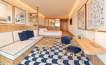 Entre las distintas estancias destacan las exclusivas Junior Suites Grand Terrace, con una terraza de más de 60 metros cuadrados amueblada con hamacas y con vistas al mar, así como la Suite Poniente, la estancia más amplia del hotel, que cuenta con dos espacios diferenciados, el dormitorio y un salón independiente con sofá-cama y vestidor.