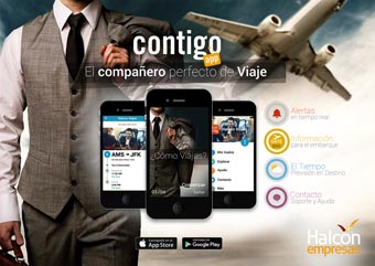 Contigo App permite al usuario organizar su viaje de una manera fácil y rápida, con sencillos menús y opciones de gestión sincronizada de agenda. Desde una misma plataforma es posibleacceder a las necesidades reales que se le plantean a un cliente cuando emprende un viaje; desde consultar el estado de su vuelo, realizar el check-in o recibir avisos de cambios de puerta de embarque, hasta la opción de buscar alternativas de ocio en su lugar de destino o la reserva de un taxi entre otras. Todos los servicios de la plataforma son gratuitos y están ya al alcance de los clientes de Halcón Empresas tanto en App Store como en Google Play.