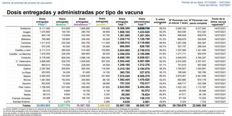 Ante estas cifras, la ministra de Sanidad, Carolina Darias, ha ensalzado que por lo que se refiere a la Unión Europea (UE), España ocupa el sexto lugar entre los Estados miembros en porcentaje de personas vacunadas con una sola dosis, el cuarto lugar en porcentaje de personas vacunadas con pauta completa, y el tercer lugar en porcentaje de población vacunada diariamente. Asimismo, «nuestro país ha sido de los primeros en conseguir la inmunización completa de la práctica totalidad de los mayores de 80 años y roza también el 100% de cobertura entre los mayores de 70 años», añade.