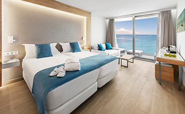 Las habitaciones de Elba Sunset Mallorca destacan por su elegante y vanguardista decoración. En ellas encontramos una cuidada combinación de colores donde predomina la calidad de los materiales, consiguiendo un estilo fresco y de lo más acogedor. Sus estancias con vistas frontales al mar son uno de los grandes reclamos de este hotel, ya que su excelente ubicación permite sentir las aguas del Mediterráneo tan cerca que ofrece la sensación única de estar a bordo de un crucero. Además, dispone de habitaciones totalmente adaptadas y con todo tipo de comodidades para los huéspedes con movilidad reducida.
