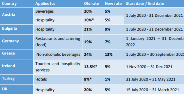 Como parte de las medidas clave para ayudar a uno de los sectores con más dificultad para afrontar el impacto de la Covid-19, algunos gobiernos europeos han introducido tipos reducidos de IVA aplicables al sector de la hostelería. Hotrec ha creado una tabla que describe el estado actual de los tipo de IVA reducidos temporalmente en estos países a 25 de febrero de 2021.