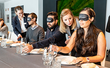 Con los ojos tapados con un antifaz, un total de 33 personas divididos en tres grupos distintos hicieron un recorrido en sendos hoteles Ilunion y, además de degustar unos platos, comprobaron de primera mano las dificultades a las que se enfrentan las personas ciegas o con discapacidad visual grave ante situaciones tan cotidianas como caminar por un sitio desconocido o sentarse a comer en un restaurante o cualquier otro lugar fuera de su círculo habitual.