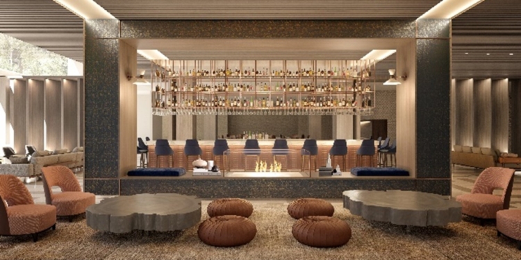 Al entrar en el vestíbulo, el hotel da la bienvenida a los huéspedes con una experiencia de check-in renovada. Lo que antes era una recepción más estándar es ahora un gran porche cubierto con elegantes consolas de madera, pequeñas luces y una galería de nichos de arte de color azul marino, para crear un ambiente acogedor desde el inicio. En el interior, una recepción compuesta por cuatro mostradores individuales de madera crean una experiencia única y personalizada.