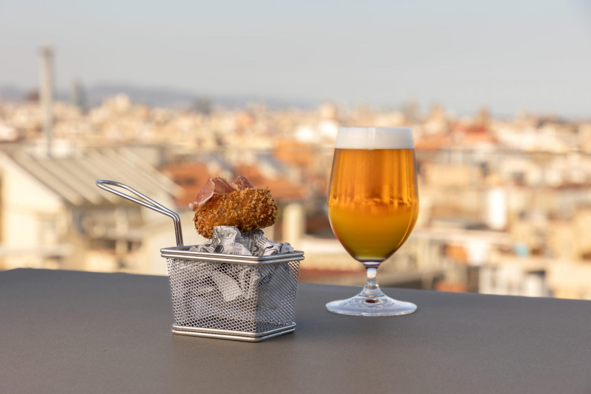 El tour gastronómico sigue en 173 Rooftop Terrace. Este espacio propone una croqueta de autor de jamón ibérico acompañado de una cerveza Estrella Damm.