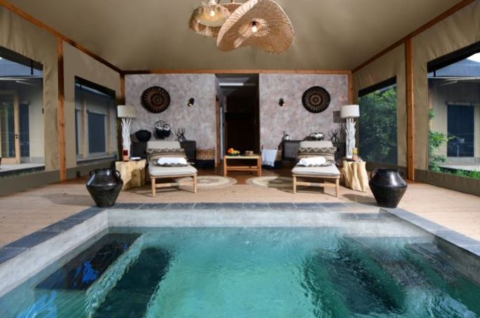 Los interiores del lodge han sido diseñados por Kristina Zanic Consultants, mezclan la sabana con el interior, inspirándose en los elementos con tonos suaves y cálidos, materiales y texturas naturales y colores autóctonos entrelazados en su diseño. Así como la suite luna de miel ofrece una piscina privada.