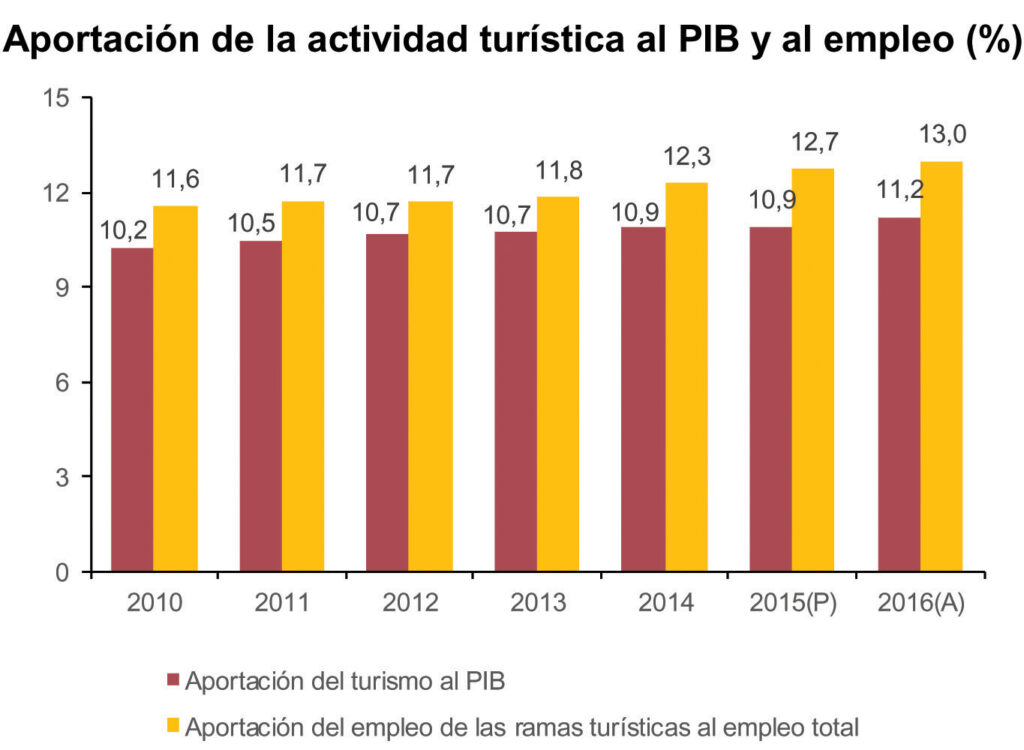 La contribución del Turismo al Producto Interior Bruto (PIB) nacional vuelve a aumentar tras el estancamiento experimentado en 2015, cuando se situó por segundo año en el 10,9%. Según la Cuenta Satélite del Turismo, informe publicado anualmente por el Instituto Nacional de Estadística (INE), en 2016 ascendió al 11,2%, tres décimas más que el año anterior. El peso del Turismo en la economía española ha subido un punto porcentual desde el año 2010, cuando se situó en el 10,2%.