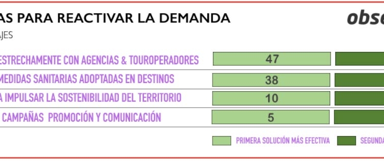 Los agentes de viajes miembros del Observatorio Nacional del Turismo Emisor (ObservaTUR) coinciden en que estrechar la colaboración con las agencias de viajes y los turoperadores será una decisión fundamental que contribuirá a que los destinos consigan remontar gradualmente la crisis. De hecho, un 78% lo señala como la primera o segunda solución más efectiva. Así, consideran que, tras la pandemia los destinos turísticos tendrán que reforzar su protagonismo para transmitir la nueva realidad generada en sus territorios tras la crisis sanitaria, en donde la seguridad jugará un rol clave.