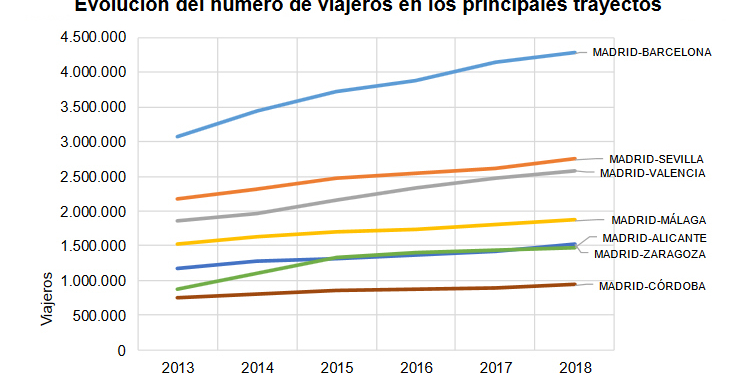 Según revela un informe de la Comisión Nacional de los Mercados y la Competencia (CNMC), de la cifra total de pasajeros, 21,3 millones corresponden a la alta velocidad, con una cuota de mercado del 63,4% y un crecimiento del 1,1% respecto a 2017. Por su parte, los servicios de larga distancia convencional suman 12,3 millones de usuarios, equivalente al 36,6% del mercado, y registran un avance interanual del 4,3%.