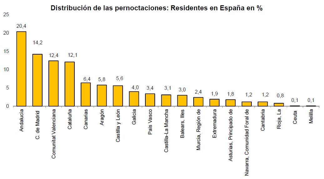 Los principales destinos de los residentes españoles son Andalucía con tasa anual de variación en el número de pernoctaciones del 1,1%; seguido de la Comunidad de Madrid con un 2,8%; la Comunidad Valenciana con un 1,7%; y ocupando el cuarto lugar, tras una bajada del 4,2%, se encuentra Cataluña. Canarias es la preferencia de los no residentes con un 48,4% del total de pernoctaciones, aunque registra un descenso del 1,5% con respecto al año anterior. Seguidos del archipiélago se encuentran Cataluña con un 15% y Andalucía con un 12,8%.