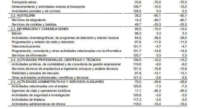 A este respecto, durante el primer mes del año, el descenso generalizado de la facturación de todo el sector servicios ha sido del 3,9%, respecto a 2019. Así, por ramas de actividad, en el conjunto del año 2020, todos los sectores presentan tasas anuales negativas. Actividades profesionales, científicas y técnicas (-7,3%), Información y comunicaciones (-8,4%) y comercio al por menor (-8,9%) presentan las menores bajadas. Por su parte, hostelería (-60,5%) y actividades administrativas y servicios auxiliares (-27,5%) registran los mayores descensos.