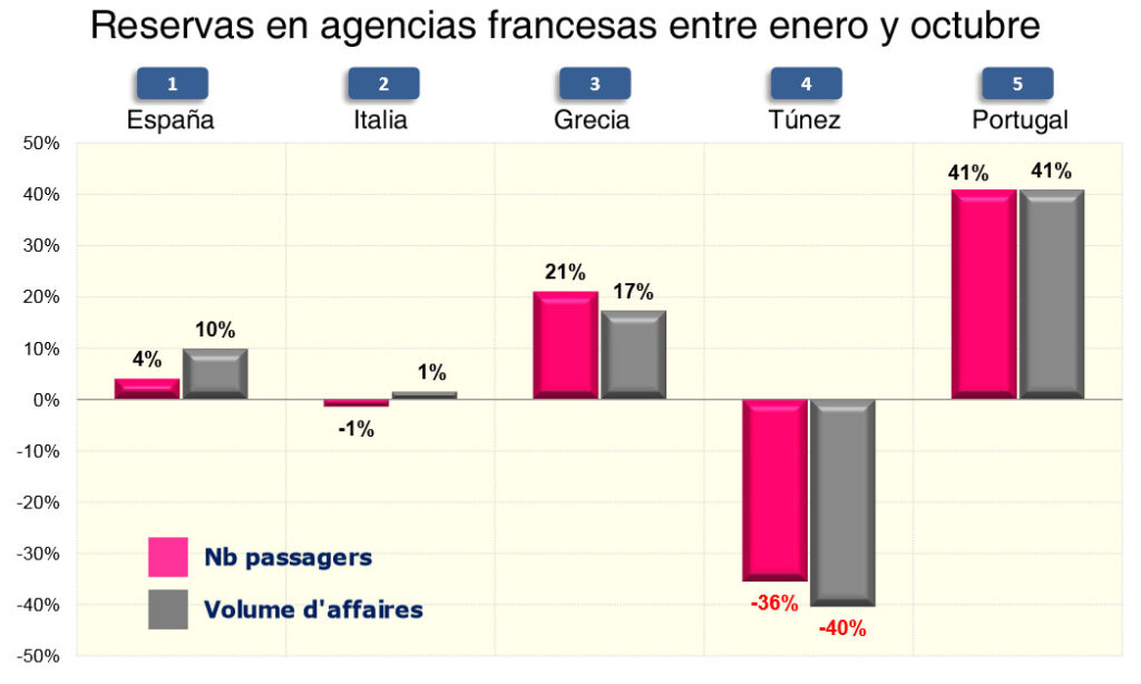Según revela el último barómetro de la Asociación Francesa de Agencias de Viajes (SNAV), ambos países desaparecen en octubre del ranking de los destinos de media distancia más visitados por los turistas procedentes de Francia. En función de los datos proporcionados por las agencias del país, Grecia y Portugal, en tercer y sexto lugar, son los destinos que salen mejor parados en dicho mes, con crecimientos respectivos del 42% y 14%.