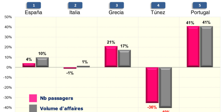 En el periodo acumulado, Túnez y Turquía aún permanecen entre los seis primeros destinos de media distancia, si bien muestran fuertes caídas del 36% y del 30%, respectivamente. España, por su parte, gana un 4% de viajeros en relación al año anterior, mientras que Italia registra un ligero avance del a%. Destacan en los diez primeros meses las subidas de Grecia y Portugal, con variaciones favorables del 21% y del 41%, respectivamente.