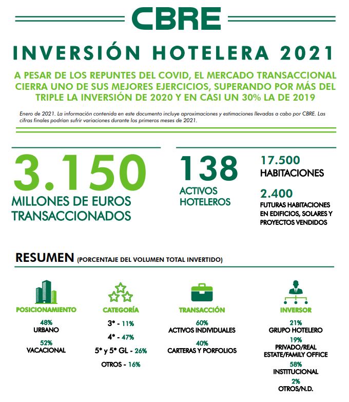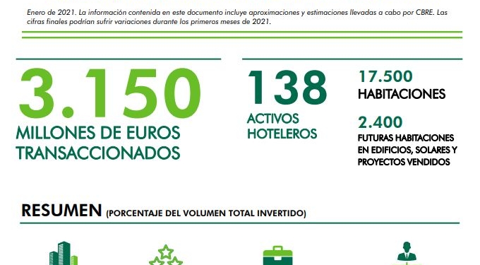 En 2021, CBRE Hotels se ha vuelto a posicionar como líder del mercado, habiendo asesorado en la venta de 5 hoteles por valor de 250 millones de euros.