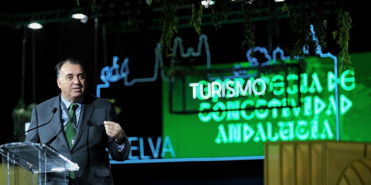 El consejero de Turismo, Cultura y Deporte, Arturo Bernal, presenta en la Feria Internacional de Turismo (Fitur) de Madrid el Plan de Conectividad andaluz 2023-2025, estrategia que tiene entre sus objetivos incrementar un 8% en este periodo la oferta de asientos en vuelos hacia el destino.