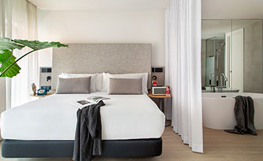 El hotel cuenta con 102 habitaciones diseñadas de manera sostenible: ítems sostenibles como sábanas, albornoces y amenities de firmas con bajo impacto medioambiental. Además, todas las categorías de habitaciones incluyen minibar gratuito de reposición diaria con zumos y bebidas locales entre las que se encuentra la cerveza Ámbar, primera marca en ofrecer opción sin gluten entre sus variedades.