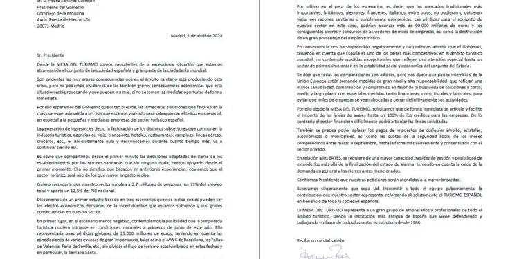 El presidente de la Mesa de Turismo reconoce que no puede admitir que el Gobierno «no contemple medidas excepcionales que reflejen una atención especial hacia un Sector de primerísimo orden en la estabilidad social y económica del conjunto del Estado». «Nos duele que países miembros de la Unión Europea estén tomando medidas de gran nivel y alta responsabilidad, que reflejan una mayor sensibilidad, comprensión y compromiso» aprobando medidas financieras, laborales y fiscales para favorecer a las empresas turística.