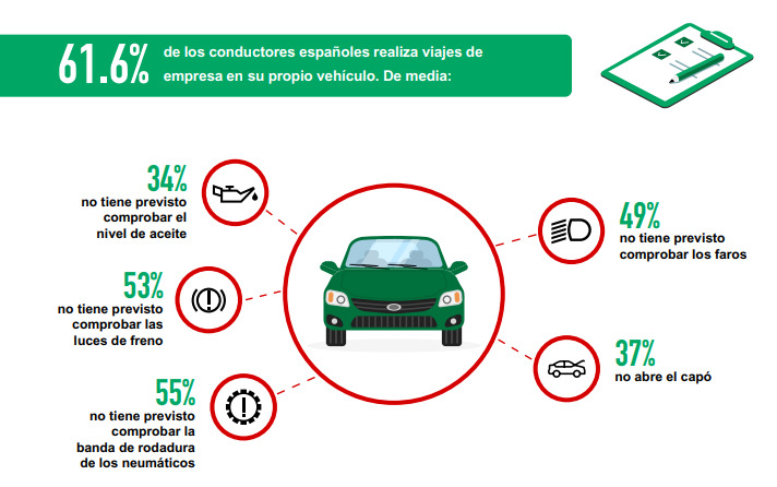 La principal e inquietante conclusión del informe revela que cerca de la mitad de los españoles que utilizan sus coches para viajes de negocios sólo los revisan cuando pasan la ITV, lo que puede poner en riesgo la seguridad de los empleados. Esta evidencia pone sobre la mesa la necesidad de que las empresas revisen su política de viajes para sus empleados.