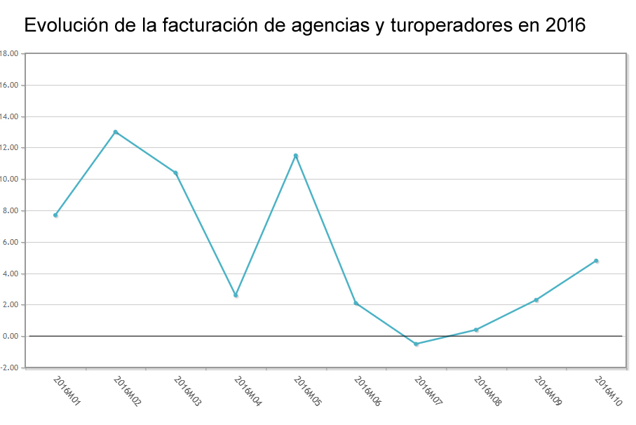 Volviendo a los datos de octubre, cabe destacar que el Sector de agencias evoluciona de forma mucho más favorable que el sector servicios en su conjunto, cuya facturación sube un 2,8% en relación al año anterior. En lo que respecta al resto de ramas turísticas, los mayores aumentos corresponden a los servicios de alojamiento y a los de restauración, con tasas respectivas del 7,5% y del 5,7%. Mientras tanto, el transporte aéreo y el ferroviario cierran el mes con tímidos repuntes del 1,5% y del 1%, respectivamente.