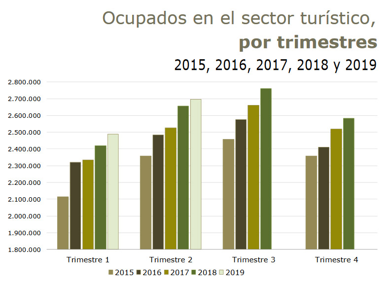 Mientras que en la economía nacional la tasa de paro se sitúa en el 14%, en actividades turísticas es del 11,1%, cifra inferior a la del mismo trimestre de hace un año. Estos valores son los más bajos registrados en el segundo trimestre desde el año 2009, estando cada vez más cerca de los niveles alcanzados antes del estallido de la crisis económica.