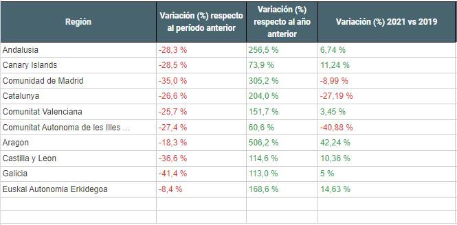 De este modo, en algunas Comunidades se rompe la tendencia positiva de mejoras en las últimas semanas respecto al 2019. A pesar de que todas ellas siguen por encima de los niveles de 2019, Baleares (-40,8%), Cataluña (-27-1%) y la Comunidad de Madrid (-8,9%), pierden terreno en comparación con antes de la pandemia. El resto de destinos no muestra mejoras sustanciales entre dichos periodos, salvo Aragón, que sí que crece notablemente (+42,2%).