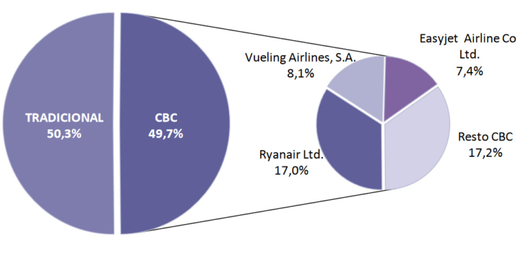 Ryanair, Easyjet y Vueling dominan, con amplio margen, el tráfico low cost en España. Entre las tres acaparan en octubre el 33,9% del total del flujo aéreo, porcentaje que se eleva hasta el 67% si se tiene en cuenta solo los movimientos en esta modalidad aérea. Todas ellas muestran avances interanuales.