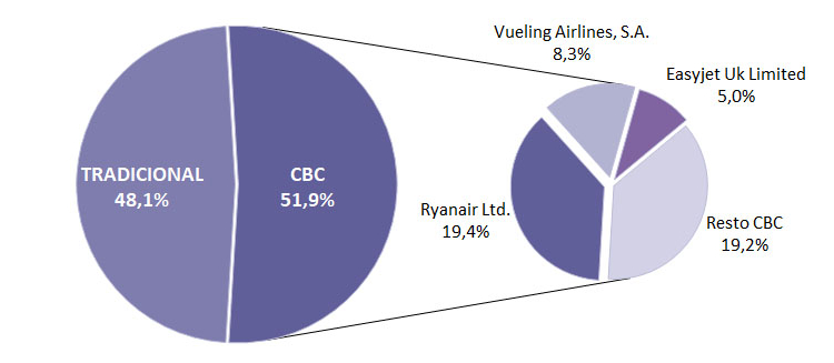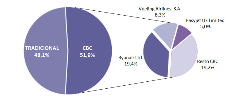 Las principales compañías aéreas de ‘bajo coste’ (Ryanair, Vueling y Easyjet) lideran el mercado con el 32,7% del total del flujo aéreo de pasajeros internacionales recibido en España en septiembre y el 62,8% del tráfico low cost. Vueling y Ryanair muestran una evolución positiva. En cambio, Easyjet encadena seis meses seguidos de descensos.
