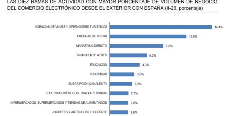 Las áreas de actividad relacionadas con el Sector Turístico han acaparado el 22,7% de las compras que desde el extranjero se hacen en webs de comercio electrónico españolas durante el segundo trimestre de 2020. Según los datos de la Comisión Nacional de los Mercados y la Competencia (CNMC) las agencias de viajes y operadores turísticos abarcan el 14,4% de estas transacciones. Sin embargo es una cifra muy inferior a la registrada en el primer trimestre del año, cuando su cifra de volumen de negocio alcanzó el 46,7%. En cambio el transporte aéreo sí se muestra más estable. En este trimestre acapara un 5,3% de las transacciones desde el exterior, mientras que en el pasado obtuvo un 5,5%.