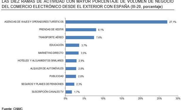 Las áreas de actividad relacionadas con el Sector Turístico han acaparado el 41,3% de las compras que desde el extranjero se hacen en webs de comercio electrónico españolas durante el segundo trimestre de 2020. Según los datos de la Comisión Nacional de los Mercados y la Competencia (CNMC) las agencias de viajes y operadores turísticos abarcan el 27,1% de estas transacciones. Una cifra muy superior a la registrada en el segundo trimestre del año, cuando su cifra de volumen de negocio alcanzó el 14,4%. Igualmente, el transporte aéreo también mejora. En este trimestre acapara un 7,3% de las transacciones desde el exterior, mientras que en el pasado obtuvo un 5,3%.
