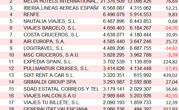 B the travel brand, sexta empresa turística que más dinero destina a esta partida, ha desembolsado 4,6 millones de euros, lo que supone un fuerte retroceso del 24,7% en comparación con los cerca de 6,2 millones de 2015. Mayor aún es el recorte de Halcón Viajes. La agencia de Globalia, que figura en décimo sexto lugar, pasa de los 5,2 millones de 2015 a algo menos de tres millones en 2016 (-42,5%).