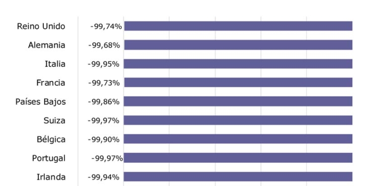 Por otro lado todos las principales regiones emisoras de pasajeros internacionales decrecieron con descensos similares y superiores al 99%. Sin embargo, esto no ha provocado que Reino Unido continúe siendo el principal país exportador de turistas a España. El 51,3% de los pasajeros internacionales procedieron de Reino Unido, Alemania y Francia. Si se observa únicamente el tráfico de las compañías low cost, estos tres países suman el 86,8% de los pasajeros que llegaron con este tipo de aerolíneas. Asimismo, en todas las Comunidades autónomas se registraron descensos superiores al 99% en el número de turistas internacionales que llegaron en abril.