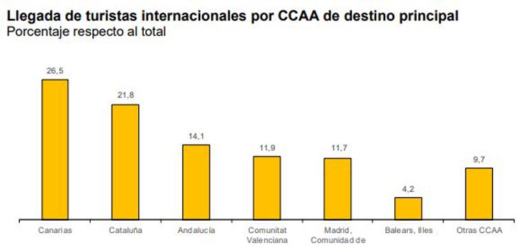 Canarias fue la principal Comunidad de destino en el segundo mes del año, con 1,1 millones de turistas, un 0,8% menos que en febrero de 2019. Por detrás se situaron Cataluña, con 964.706 visitantes, un 6,4% menos, y Madrid, con 518.261 turistas y un aumento interanual del 3,8%. Por otro lado, las Comunidades autónomas de destino principal con mayor peso en el gasto de los turistas fueron Canarias (con el 29,9% del total), Cataluña (19,8%) y la Comunidad de Madrid (16,1%).