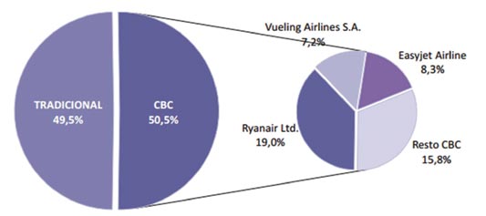 Otra de las características que parecen estar consolidándose en el sector del transporta aéreo, muy unido a la expansión de las low cost, es la concentración de pasajeros internacionales en tres compañías. Ryanair, Easyjet y Vueling obtienen en marzo el 34,6% del total del flujo aéreo. Estas empresas sumaron una cuota del 68,6% si solo se tiene en cuenta su tipo de aerolínea. Además, todas ellas mostraron un avance.