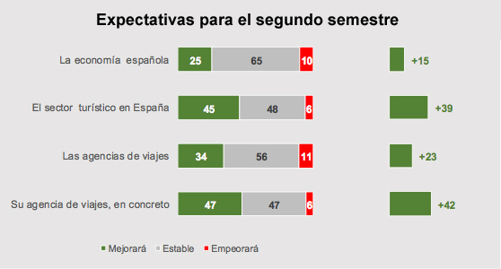 En relación a sus previsiones para el Sector de agencias en general, el porcentaje de empresas que prevé una mejora baja al 34%, con un 11% que espera un empeoramiento de la situación. Mientras tanto, el optimismo reina cuando hablan del Sector Turístico español, confiando un 45% en que se producirá una evolución positiva, frente al 6% que se muestra pesimista. Finalmente, al ser preguntadas por la economía española para esta segunda mitad de año, tan solo un 25% cree que la evolución será favorable, mientras que un 10% espera un empeoramiento.
