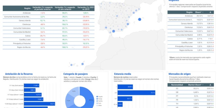 Finalmente, los datos de TravelgateX reflejan un predominio de las estancias de entre dos y cinco días. Pelean por el segundo puesto el rango de seis a siete noches, y el de una noche, representando un 20,1% y 20,9%, respectivamente. Las vacaciones de entre ocho y 14 días representan también cerca de un 7%.