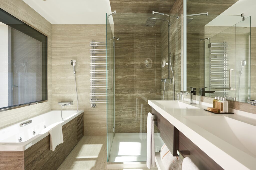 En los baños del hotel predominan los colores claros y el estilo sobrio que dotan al espacio de luminosidad y confort, en harmonía con el resto de la habitación. En esta ocasión se ha escogido la showerpipe Raindance E 360 con ShowerTablet Select 300 en su versión EcoSmart, una opción que permite ahorrar agua y energía sin dejar de disfrutar del máximo placer de ducha.