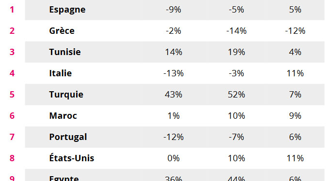 Pese a este comportamiento negativo, España se mantiene como el destino de media distancia preferido por los residentes en Francia. Su cuota de mercado en los meses de julio y agosto es del 23%. Le sigue Grecia con un peso del 16%, mientras que Túnez arrebata a Italia la tercera posición, ambos con un porcentaje aproximado del 11%. Por detrás aparecen Turquía (6%), Marruecos (4%) y Portugal (4%).