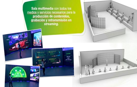 Este espacio multimedia dispone de todos los medios y servicios necesarios, pudiendo además realizar su instalación integral en cualquier otro lugar tras estudiar la ubicación para ofrecer la mejor solución técnica adaptada a tus necesidades: sistema de producción de streaming multicámara; web personalizada para la emisión del evento; dos cámaras robotizadas y una cámara con operador; pantalla ultrapanorámica para contenidos dinámicos; y creación y producción de contenidos (ppt/keynote, vídeos, infografías, contenido virtual ).