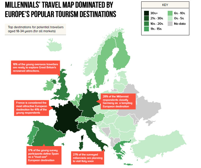 Según la información recabada por el citado organismo, a priori, la intención de desplazarse al viejo continente es muy elevada entre los millennials, si bien se observan grandes diferencias en función del país. Francia es considerado, con amplísimo margen, el destino más atractivo para estos potenciales viajeros. El porcentaje de jóvenes que tiene entre sus planes acudir a este país es del 41%, muy por encima del 28% de Alemania y del 27% de Italia, en segunda y tercera posición.