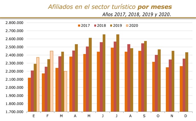 La disminución de los afiliados se ha observado en todas las ramas turísticas. Sin duda, la más afectada ha sido la hostelería que registra una caída del 15,1% con 199.240 personas menos. En cambio, en las agencias de viajes y turoperadores, a pesar de los numerosos Expedientes de Regulación Temporal de Empleo (ERTE) y la mala situación que atraviesan, el número de afiliados solo ha sufrido 3.839 bajas. El resto de actividades turísticas disminuyeron en 38.236 afiliados.