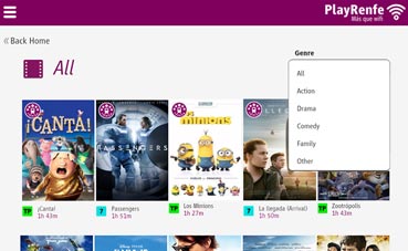 El servicio de PlayRenfe ofrece un valor añadido a la conexión Wi-Fi a bordo con una completa oferta de contenidos que incluye últimos estrenos de cine, series, música, libros y la posibilidad, por primera vez, de ofrecer eventos en directo mientras se viaja a 300 km/h. Se trata de un servicio a la carta y personalizado, pensado para todos los tipos de clientes.