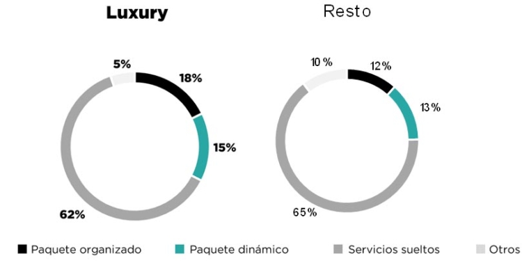 Aunque la contratación de servicios sueltos es el formato de viaje más habitual, el ‘paquete’ organizado o dinámico cala más entre el segmento luxury, acaparando el 18% y el 15% de las reservas, respectivamente. Mientras tanto, un 62% de estos consumidores premium opta por la contratación de servicios sueltos.