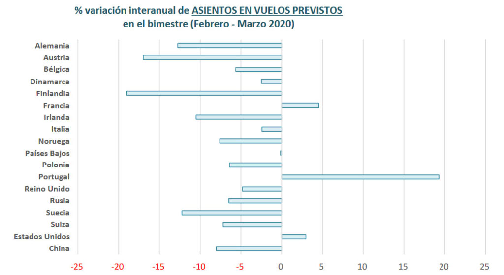 Reino Unido, primer mercado emisor de turistas hacia España, verá reducida la capacidad aérea en un 4,8%, con un total de 2,6 millones de plazas. Otro dato relevante es el recorte de asientos en vuelos desde China, emisor que se está viendo severamente afectado por el brote de coronavirus, lo que ha llevado a numerosas aerolíneas europeas a interrumpir sus operaciones. En este caso, la oferta disminuirá un 8% en febrero y marzo, con 63.483 asientos.